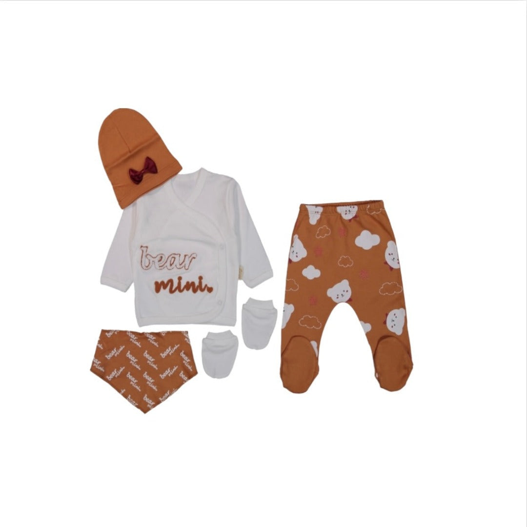 Verlieben Sie sich in unsere Newborn Set 5-Teilig von bear mini in weiß/braun! Praktische und hochwertige Kleidung, hergestellt aus 100 % Baumwolle. Perfekt für neu geborene Babys, die vor Komfort und Schönheit nur so strotzen. Für ein unvergessliches und entspanntes Erlebnis für Ihr Kleines!